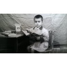 NIÑO EN ACTITUD DE LECTURA, CALENDARIO EN 19 OCTUBRE 1965-66. UNIFORME DE COLEGIO