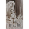 NIÑA MUY PEQUEÑA. SENTADA EN UNA PEQUEÑA CAMA IMPROVISADA EN EL ESTUDIO J. DERREY DE VALENCIA. INSCRITA POR EL REVERSO CON EL NOMBRE Y LA EDAD DE LA NIÑA A MANO Y DEDICADA. SOBRE 1920