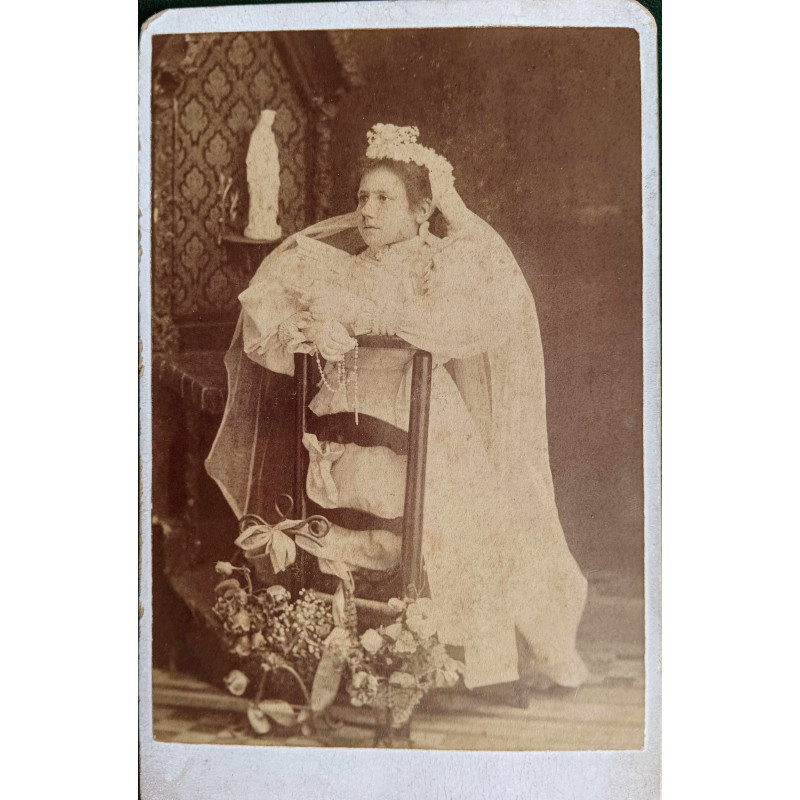 SEÑORA EN RECLINATORIO  CORONA Y VELO LARGO. FLORES E IMAGEN  EN PARED. REVERSO CON DATOS FOTÓGRAFO. 16 X 10,5 cm.